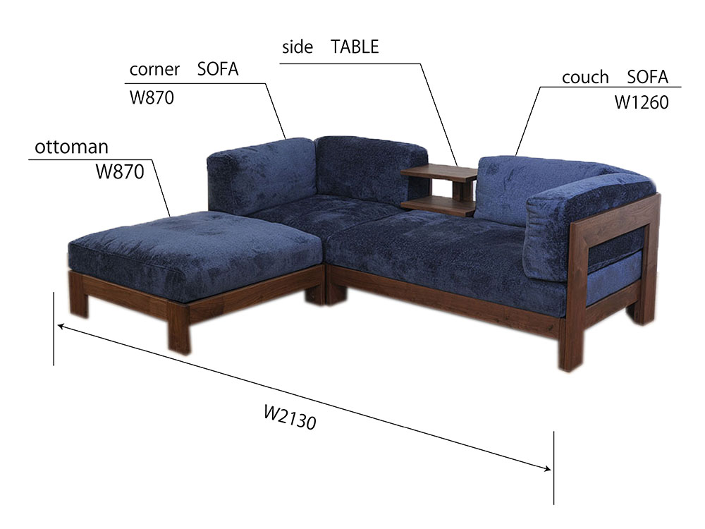 右からカウチソファー一人掛けソファーテーブルパーツコーナー用ソファーオットマンを組み合わせ、一つの大きなカウチソファーに組み上げています。