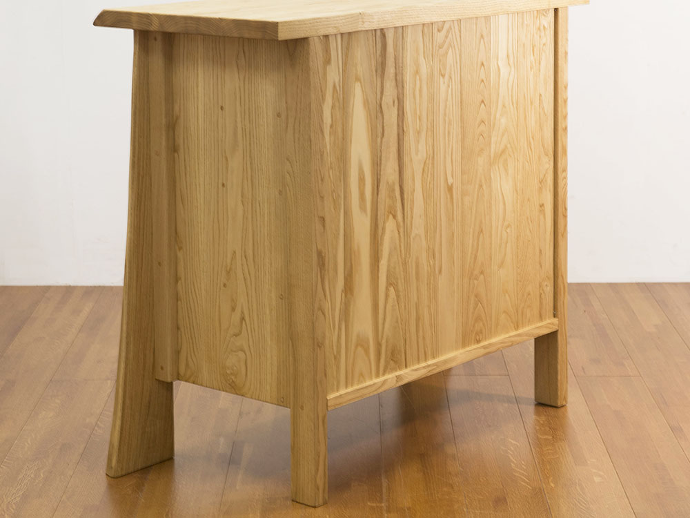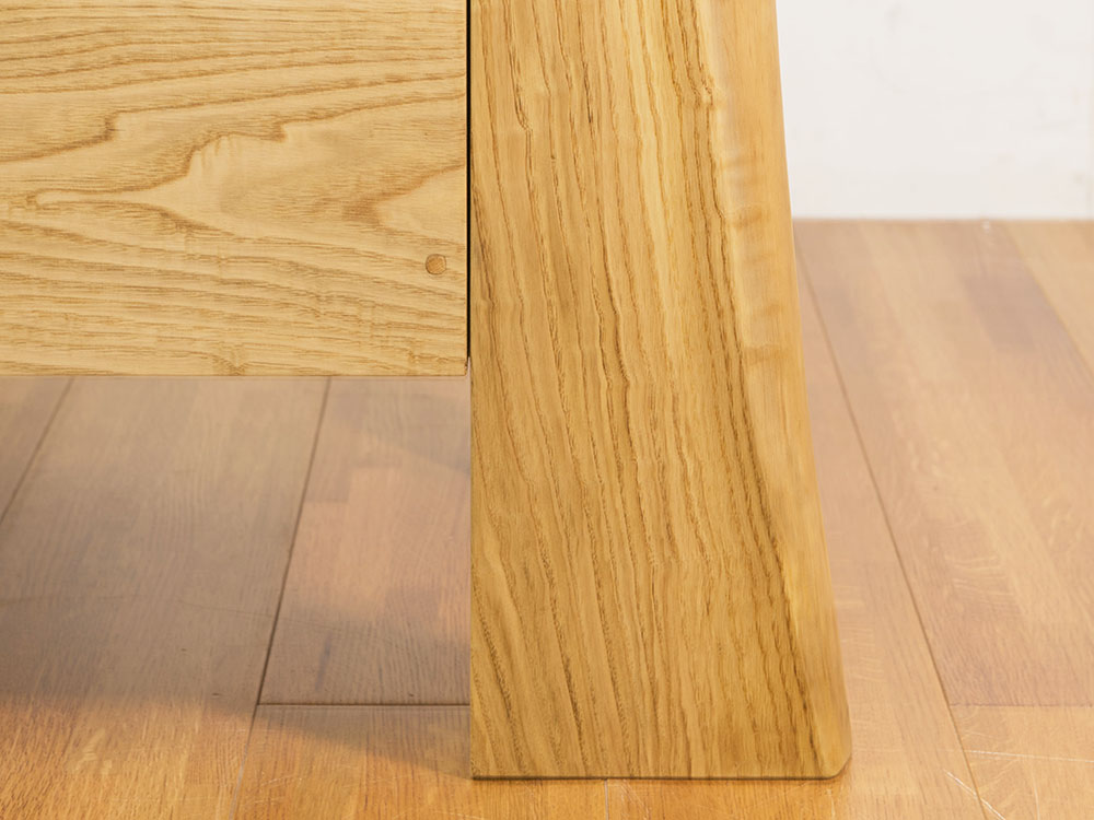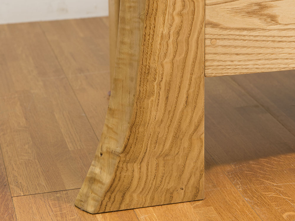 正面から見てみましょう。天板よりも少し広めに開かれた前脚には、職人が選び抜いた魅力的かつ絶妙なラインの栗の板が使われています。