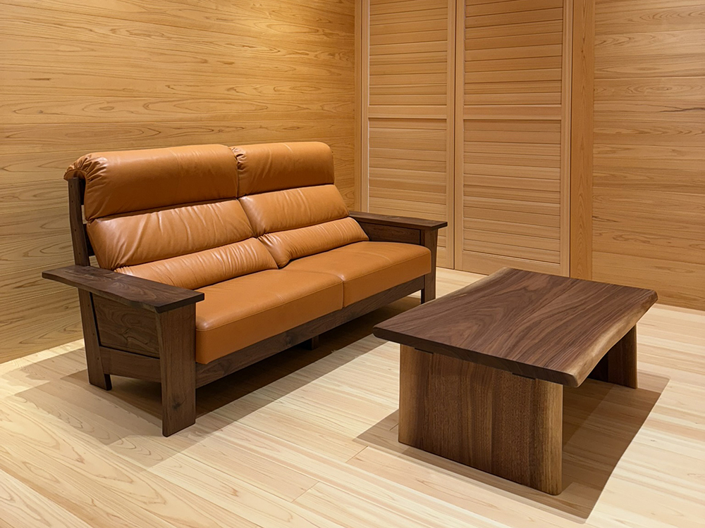 つくば店にて運命の出会いとなったこちらのソファー。九州の職人さんのベストセラー。ウォールナットのシックな色あいとキャメル色の革の組み合わせ。このお部屋のために作られたのかと思うほど空間にぴたりと調和しています。そしてそのソファーに似合うよう、特別におつくりしたウォールナットのセンターテーブル。流れるような美しい木目と、重厚感のある脚のデザインが良いですよね。