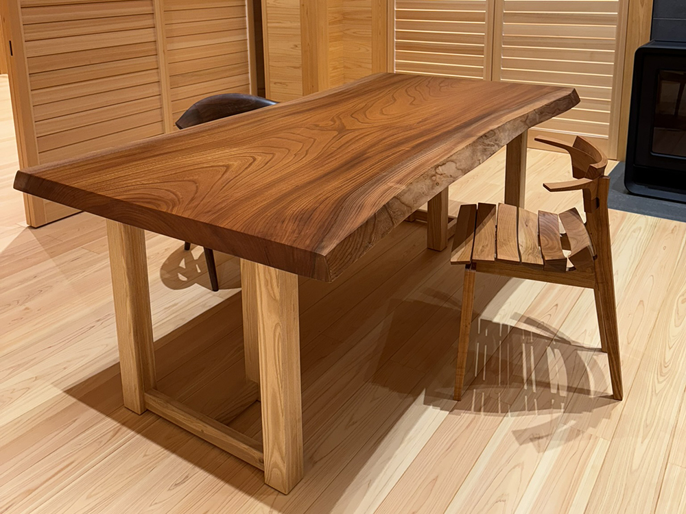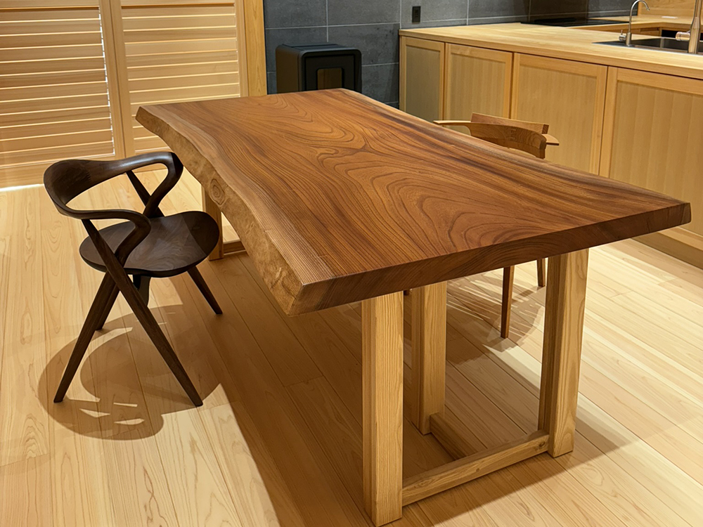 シンボリックな役割を担うテーブルは、どんなものがいいのだろうと考えた結果、やはり「ケヤキの一枚板」をご提案させていただきました。