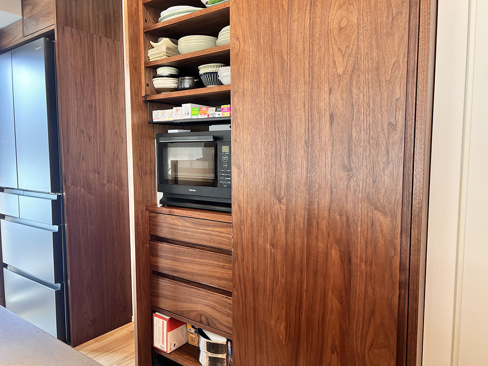 また、背面の食器棚をセットするスペースには、天井いっぱいの大きな収納をおつくりさせていただきました。