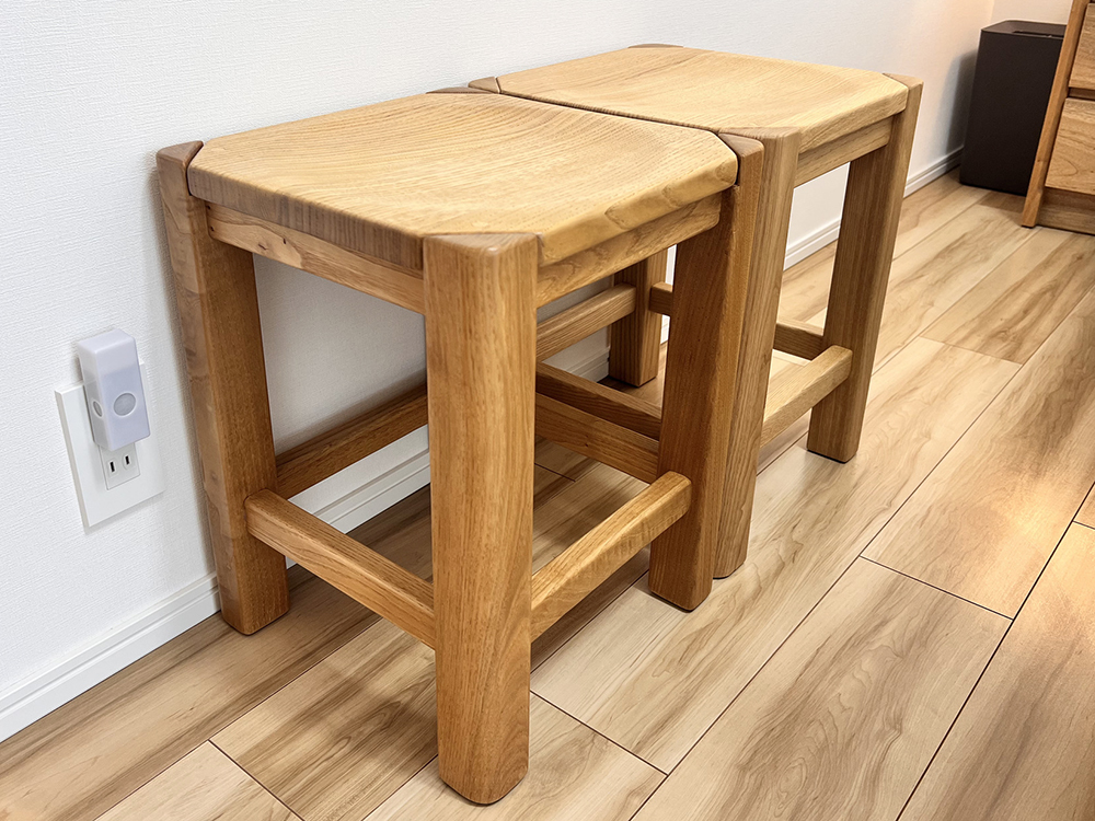 栗の木のスツールも2個セットで。