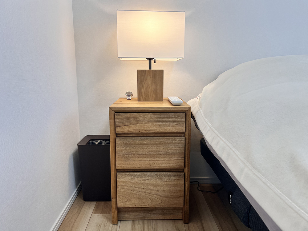 寝室には頑固おやじオリジナルの樟の家具を置かせていただきました。